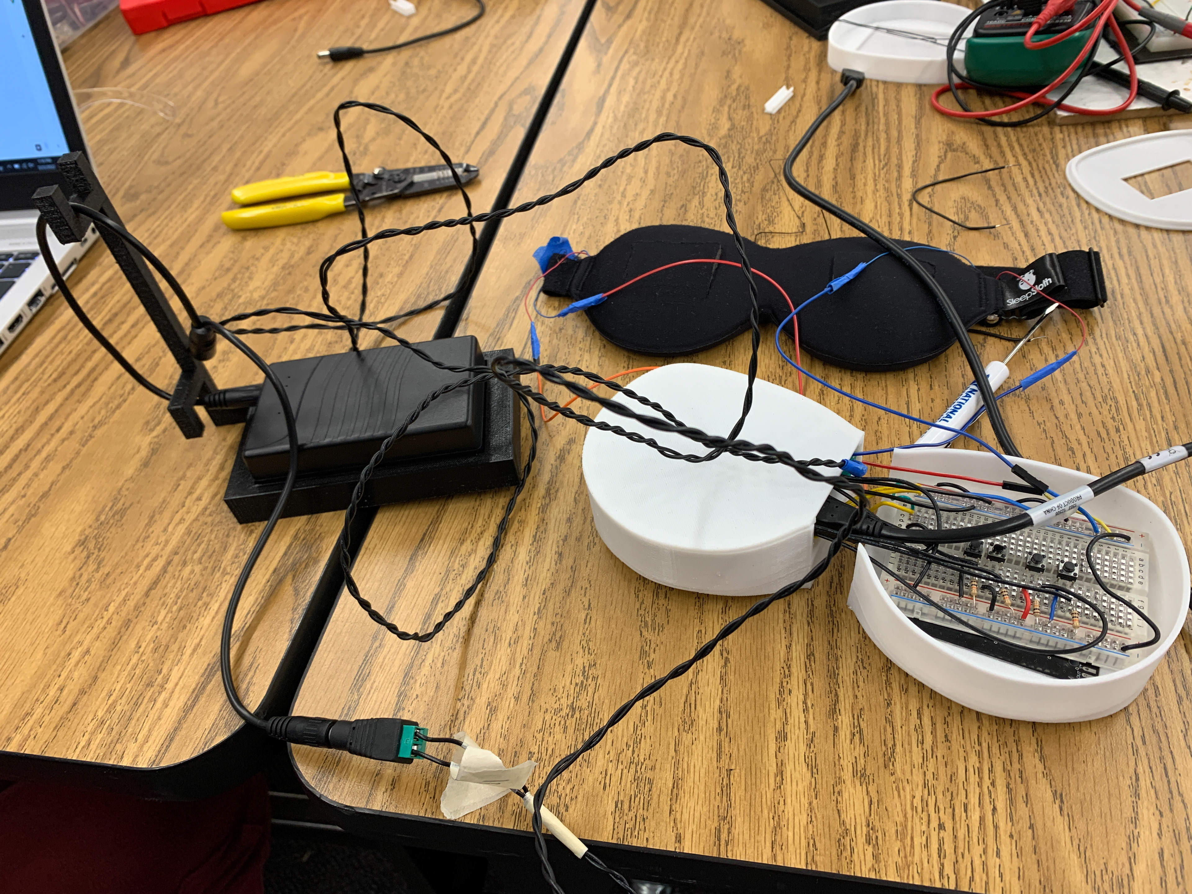 The design features 3 main components: vibration motors, LED panels, and speakers (not yet implemented). These components are controlled by an Arduino and housed by a custom 3D printed case. The top left picture demonstrates how the 3D housing was designed to conform to the face shape. The top right picture shows the Arduino controlling two LED panels that are programmed to gradually become brighter in the morning to simulate the sunrise. The bottom left shows the internal design. The 4 buttons are used to set the alarm. The right bottom picture portrays the soft sleep mask that is used as the base and the two vibration motors tucked on the side of the face mask. Similar to the LED lights, the vibration motor gradually increases intensity to help the user achieve a more natural and stress free waking experience.